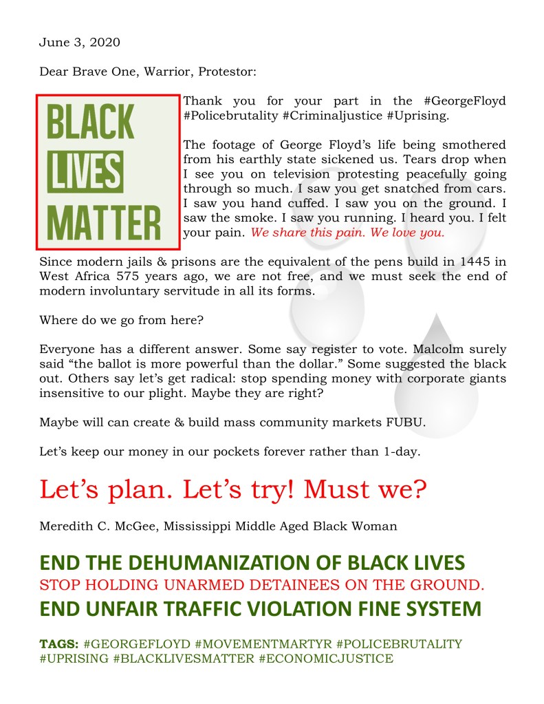 Meredith C. McGee Statement #GEORGEFLOYD #UPRISING 3 Jun 20203 Jun 2020Meredith Etc ... OFFICIAL SITE, online bookstore/publisher, Jackson, MS Share this: Click to share on X (Opens in new window) X Click to print (Opens in new window) Print Click to email a link to a friend (Opens in new window) Email More Click to share on Facebook (Opens in new window) Facebook Click to share on LinkedIn (Opens in new window) LinkedIn Click to share on X (Opens in new window) X Like Loading... Related