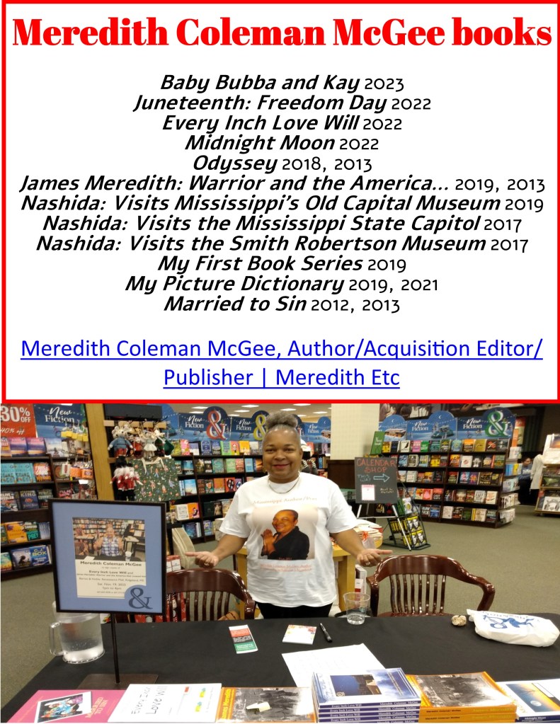 Sat—January 28, 2023—9:00 AM – 3:00 PM. Meredith Coleman McGee will sale and sign books at the Annual Women’s Health Conference – Hilton Jackson, 1001 East County Line Rd. Jackson, Mississippi –