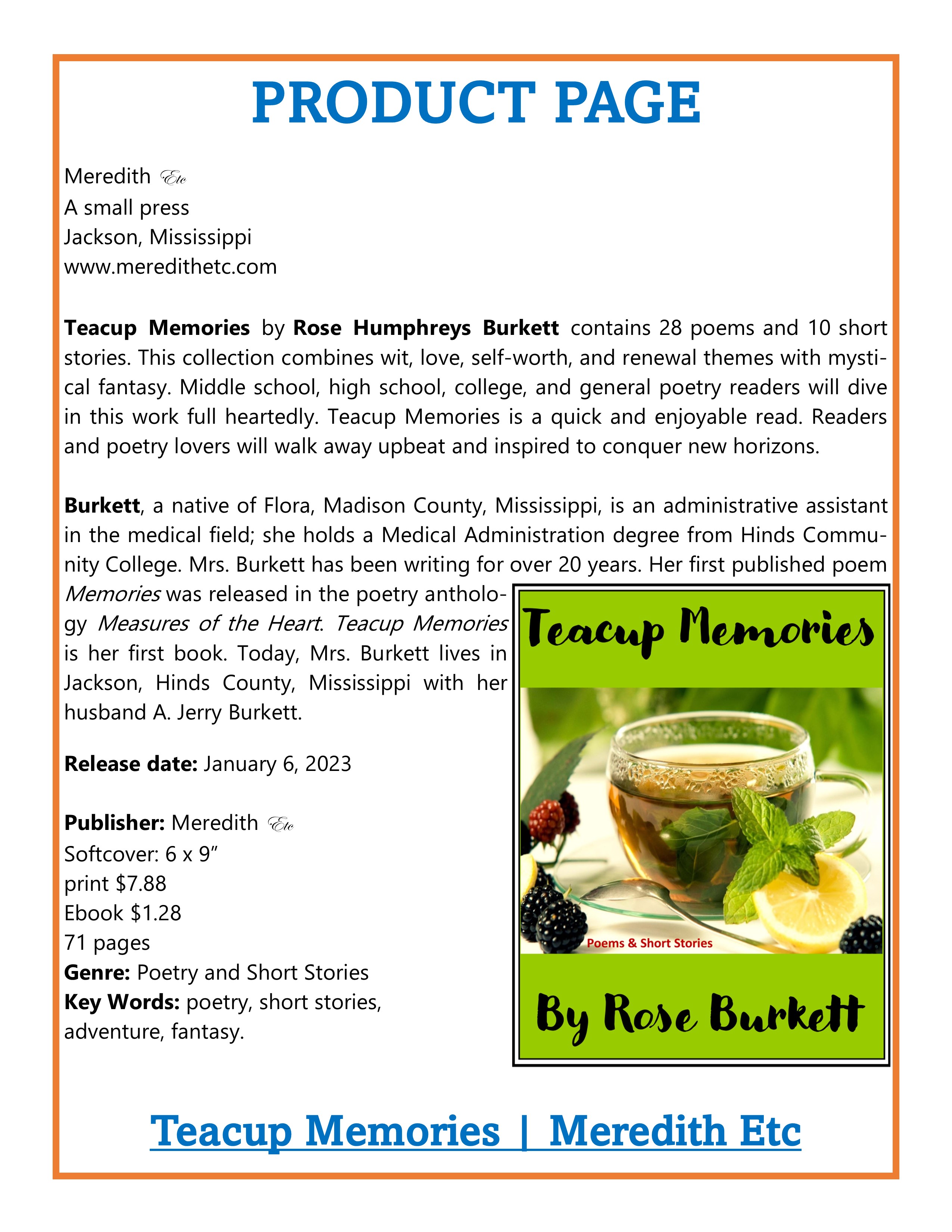Meredith Coleman McGee, representing Meredith Etc is a book vendor at the 4th Annual South Jackson Festival and Parade. The BOOK TABLE via FESTIVAL site – Cardozo Middle School on McDowell Rd. in South Jackson near Hwy. 18 – April 15, 2023 from 9:00 a.m.- 2:00 p.m.