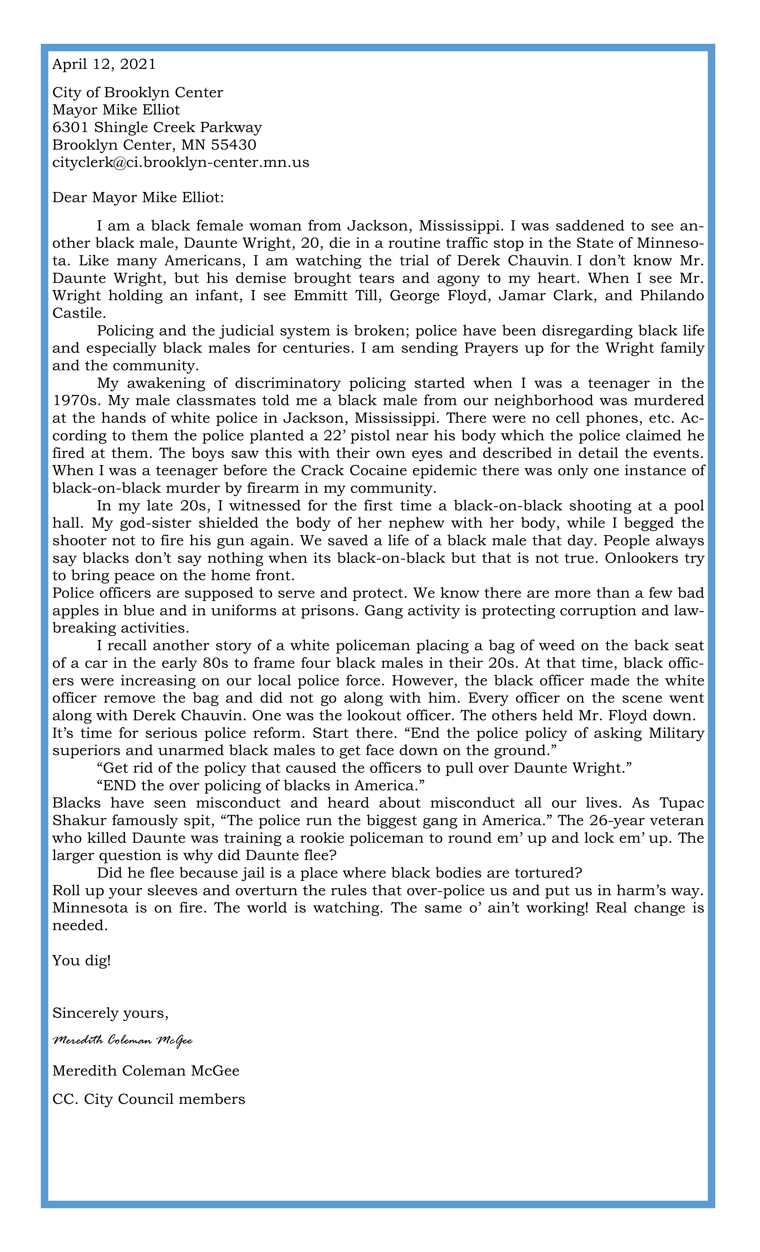 Letter to City of Brooklyn Center Mayor Mike Elliot