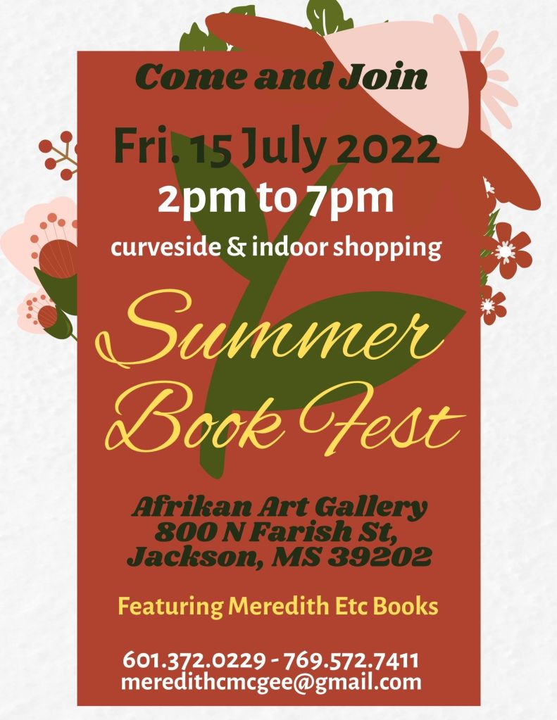 The South’s finest writers headed to Greenville, MS – Sat. May 21, 2022. May Book Fest. 1:00p.m – 5:00 p.m. The Book Gallery. 647 S. Theobald St., Greenville, MS 38703. 662.820.5047 – featuring Gwendolyn Maberry Bell, Meredith Coleman McGee, Malesha Smith, Irma Mae Rodgers Walker, Janice Neal-Vincent, William Trest Jr., Shirley Francis, and Rosalind Thomas McCreary.